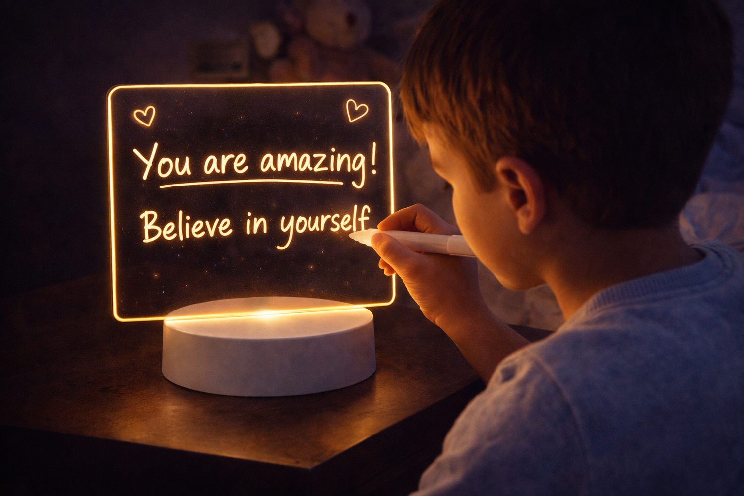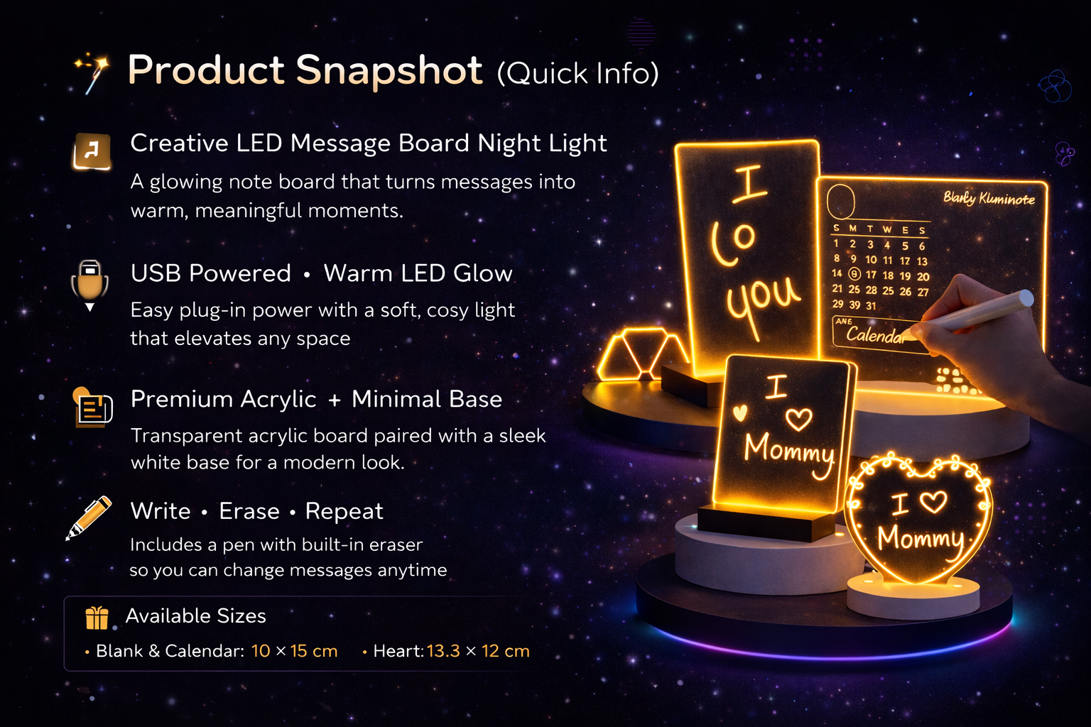 It’s a creative LED night light and USB message board that lets you write glowing notes, reminders, or messages. A perfect blend of décor, function, and emotion.
